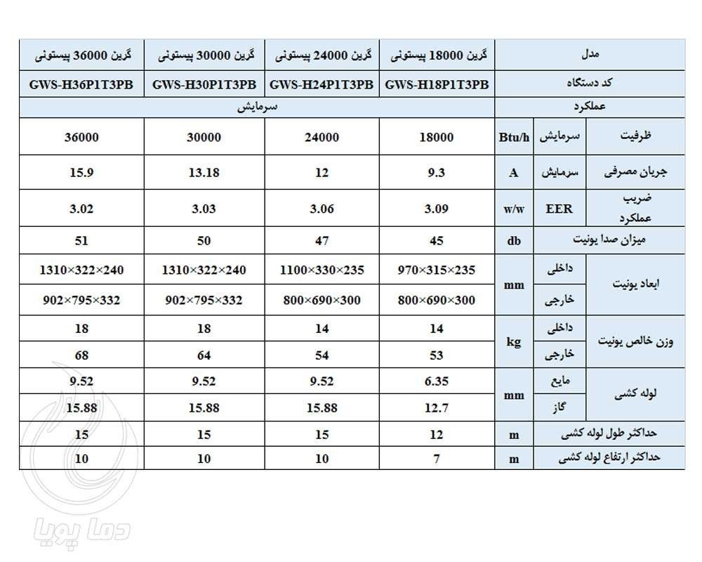 کولر گازی گرین 18000 سرد پیستونی مدل GWS-18P1T3PB با برخورداری از کمپرسور قدرتمند روتاری و نیز بهره مندی از گاز مبرد R410 دارای رده مصرفی انرژی A می باشد که در واقع می توان گفت از کم مصرف ترین محصولات تهویه مطبوع است کد در بین فروشندگان رایج است. در واقع این سیستم ها از کمپرسورهای تیپ T3 که از کیفیت و قدرت منحصر به فرد برخوردار هستند که توانسته اند چندین تست را پشت سر گذاشته و در آزمایشگاهای معتبر آزمایش شده اند، به همین جهت به جرات می توان گفت اسپلیت گرین 18000 سرد پیستونی برای استفاده در مناطق آب و هوایی گرمسیری نظیر مناطقی که در کشور ایران موجود می باشند نیز مناسب می باشند (مانند استان های جنوبی و سایر شهرهایی که حداکثر دمای تابستان حدود 55 درجه دارند). کولر گازی گرین 18000 سرد پیستونی در ظرفیت 18 تن تبرید مناسب برای استفاده در فضاهای مسکونی و ادارات، بانک ها، مجتمع های بزرگ استفاده می شود که به همین جهت می توان گفت از اسپلیت برای منازل مسکونی تا متراژ حداکثر 90 متر مربع، استفاده در فضاهای اداری با متراژ حداکثر 60 متر مربع و استفاده در فضاهای فروشگاهی با متراژ حداکثر تا 40 متر مربع می باشد. قابل استفاده و جوابگویی است.